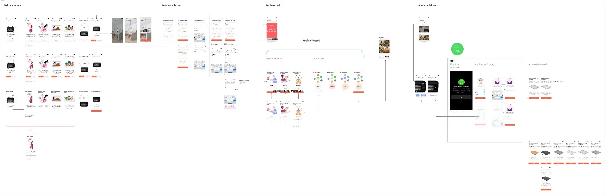 I had the pleasure to join June in the smart cooking industry and I was charged with defining the app’s voice. I developed the visual and illustrative language for the New User Experience. Below are the illustrations I produced for the New User onboarding flow, followed by the user flow documentation for the experience.