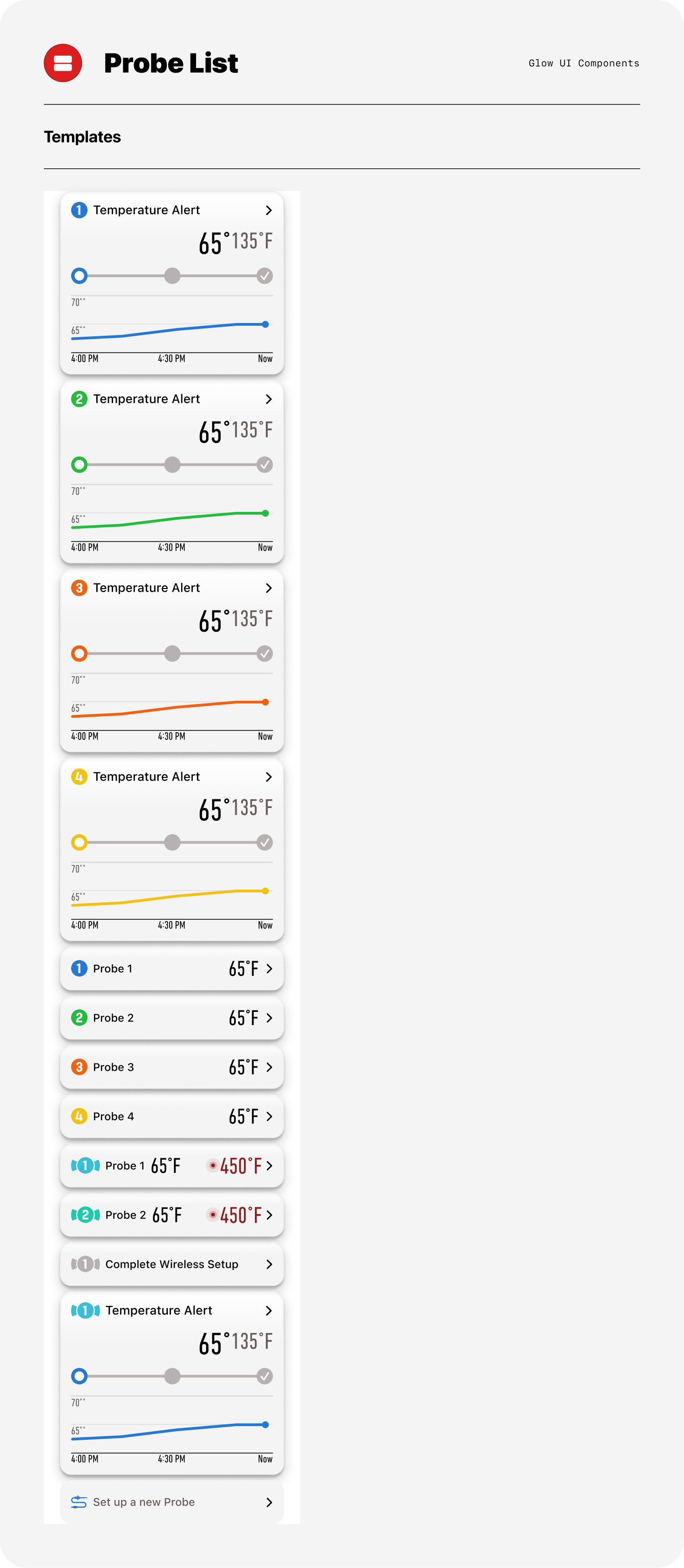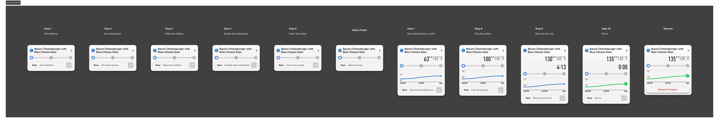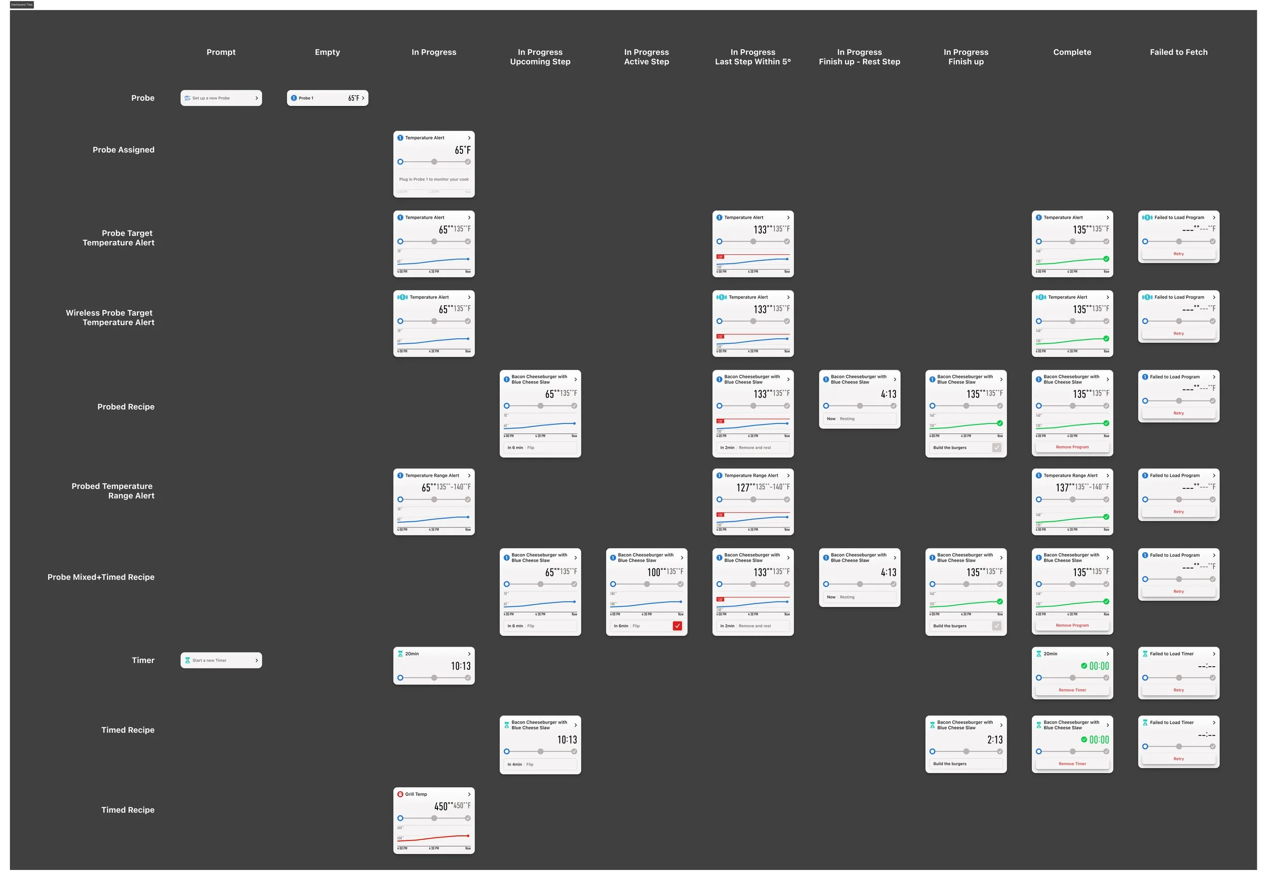 Sample pebble card matrix showcasing recipe modules that integrate probe and timer functionality across multiple cooking states. The matrix demonstrates how a flexible component adapts to varying data conditions while maintaining consistency in structure, behavior, and visual hierarchy.