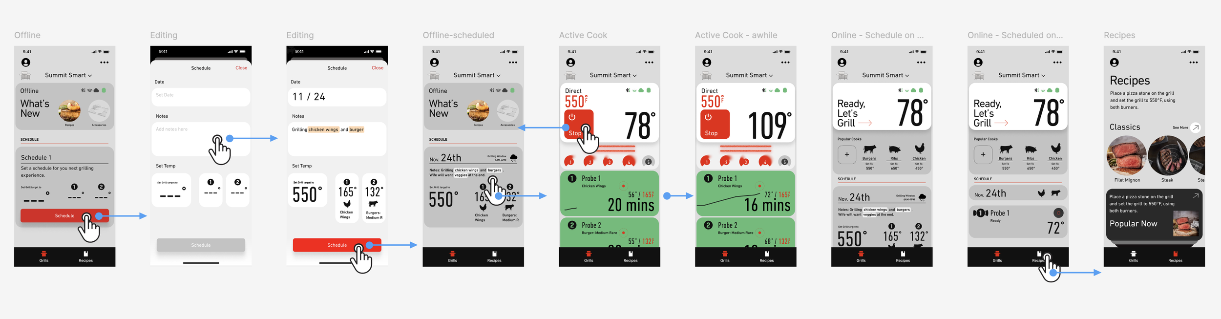 As engineering capacity expanded, I evolved the dashboard from a basic status view into a sous-chef companion that actively guides users toward grilling mastery. I mapped the end-to-end journey—pre-pairing, paired offline, ready, and cooking—and introduced AI-powered planning in the offline state. Through simple natural language input, the system auto-configures temperatures, probes, and timing, enabling one-tap setup and transforming a fragmented process into a seamless experience.